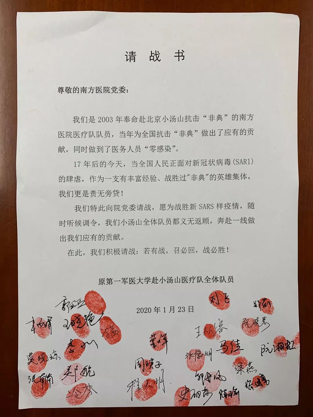 1月23日,一封来自广州南方医院的“请战书”在网络流传,发起的是原第一军医大学南方医院赴小汤山医疗队(下称“赴小汤山医疗队”)。他们在“请战书”的末尾写道,“若有战,召必回,战必胜!”并印上24个红手印和签名。