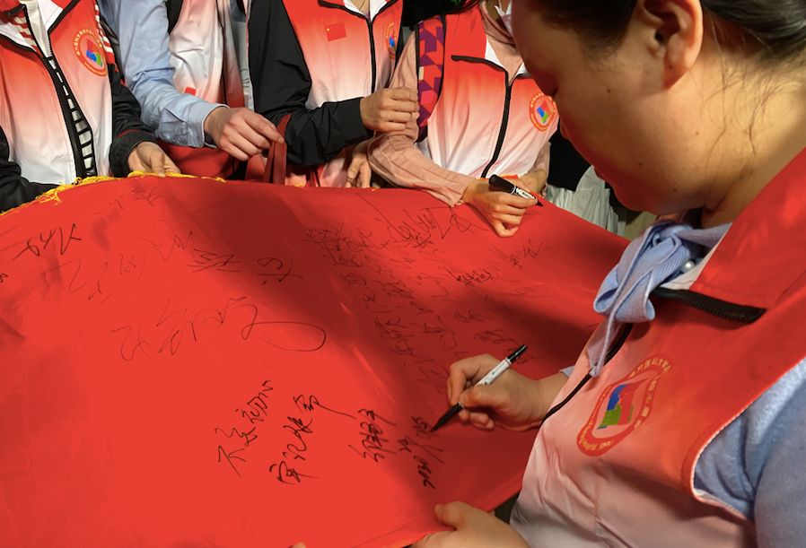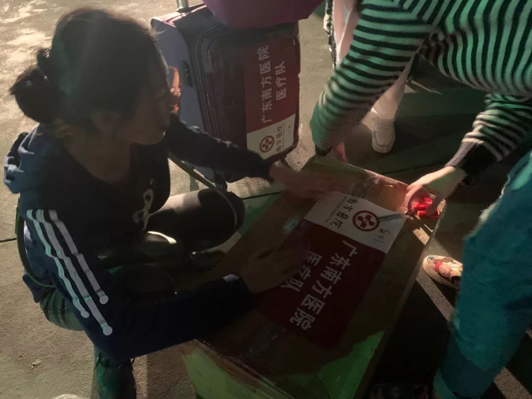 出发前,队员们换上红色的志愿者服,在行李箱上贴上了“广东南方医院医疗队”的贴纸,排成一排,喊了三声“南方医院医疗队加油”的口号,便登上了前往机场的大巴。