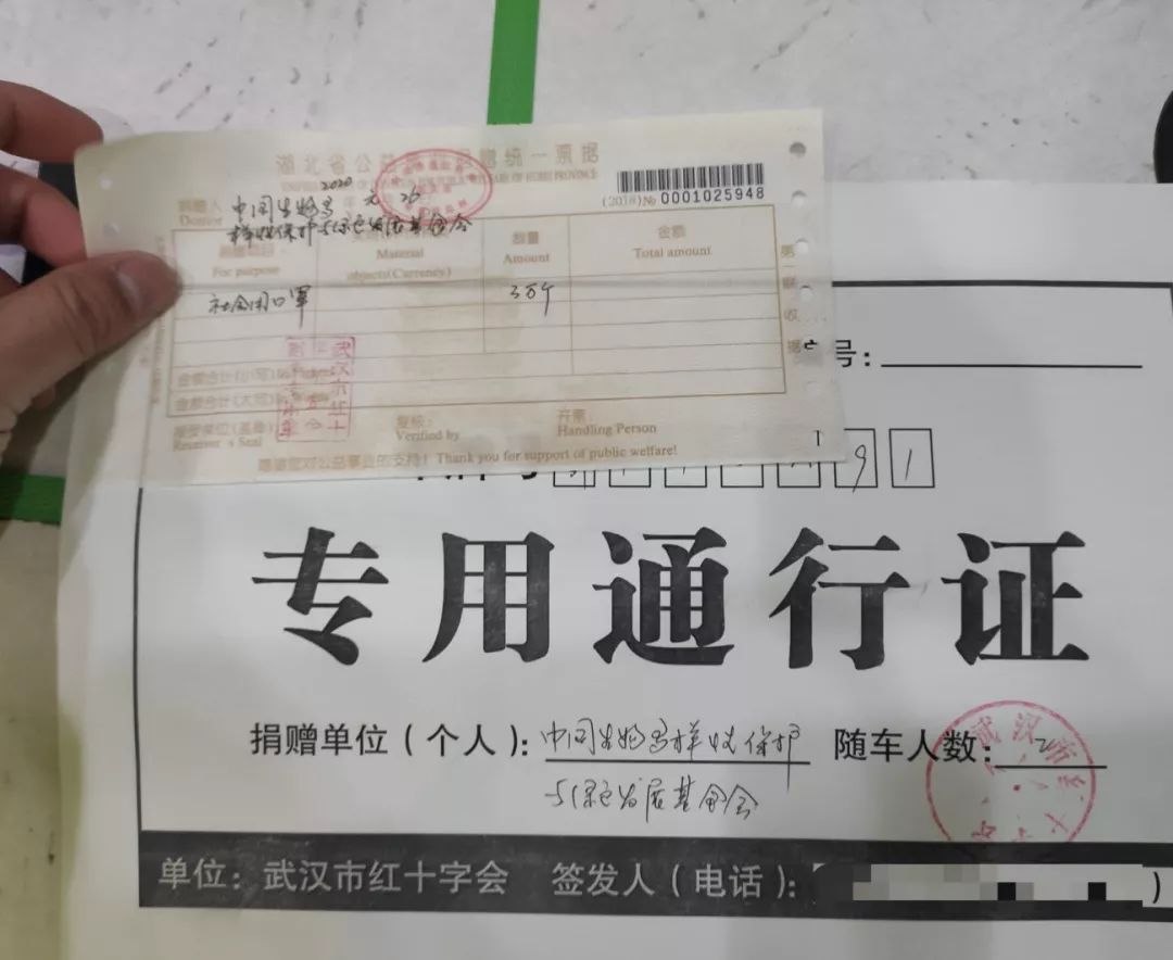 但肖昌文明白,这种出发后再找人疏通的办法不是长久之计。1月25日下午,他开始向武汉市红十字会求助,终于拿到了两张为外地捐赠物资车辆开出的“专用通行证”。那是一张A4纸大小的通行证,上面标明了车牌号、物资捐赠单位、随车人数,下面有武汉市红十字会的红章以及签发人姓名、联系方式。