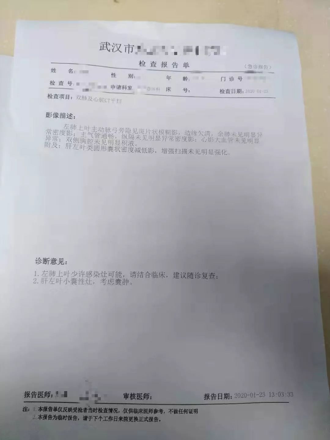 医生肺部被感染的检查报告单。受访者供图