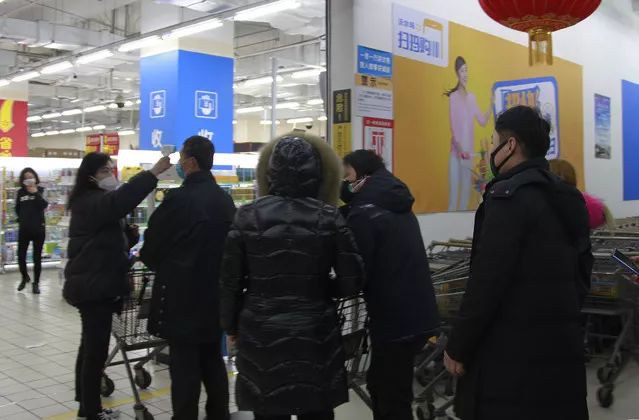 1月23日11时30分,湖北武汉的一家超市中,工作人员在入口处检查顾客体温,要求顾客必须佩戴口罩。中青报·中青网记者 王嘉兴/摄