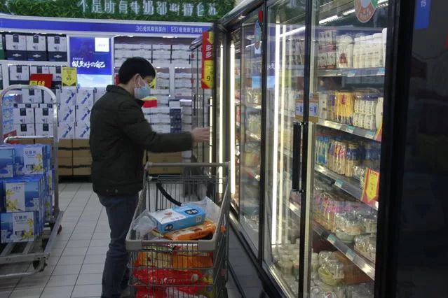 2020年1月23日11时40分,菱角湖万达沃尔玛超市,一名顾客在选购乳制品,购物车中还有一些速冻食品。中青报·中青网记者 王嘉兴/摄