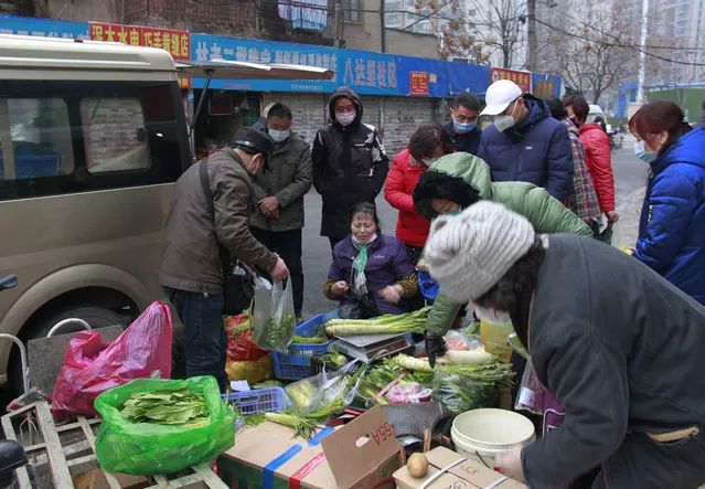 1月23日12时,湖北武汉汉口火车站附近一菜市场门口,一商户在售卖生鲜蔬菜。中青报·中青网记者 王嘉兴/摄