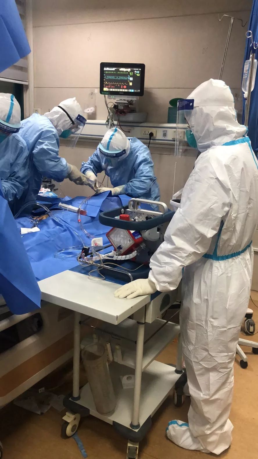 1月15日,武汉大学中南医院,医务人员正在救治一名新型冠状病毒感染的肺炎重症患者。该患者男性,53岁,医护人员为其建立了体外膜肺氧合(ECMO)治疗,目前该患者是第一个成功脱离移动心肺仪救治的新型冠状病毒感染肺炎重症患者。 武汉大学中南医院急救中心副主任 夏剑/摄