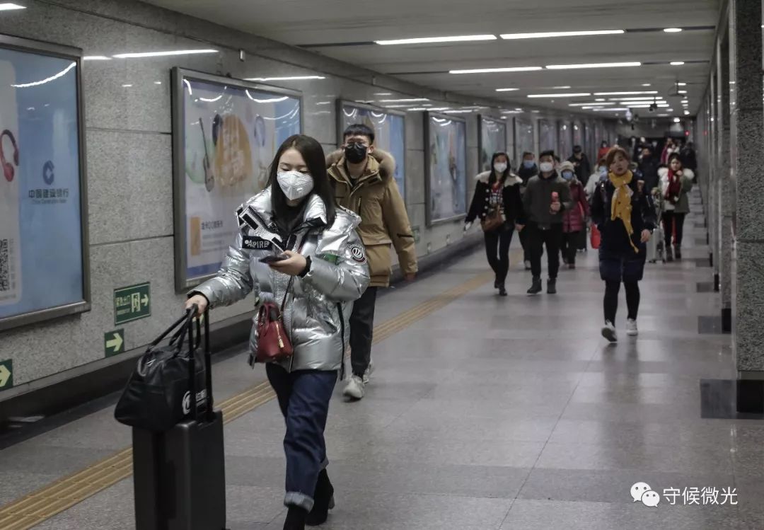 1月22日,北京地铁中,戴着口罩的行人推着行李箱走过。中青报·中青网见习记者 孔斯琪/摄
