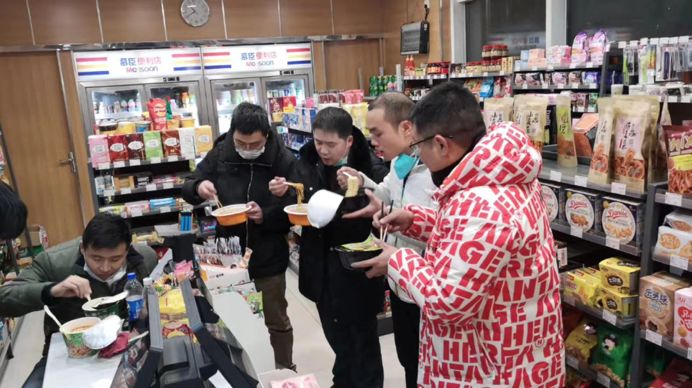 凌晨发完口罩后,大家一起吃“饭”。