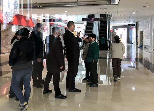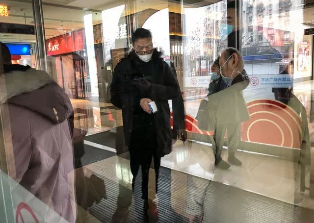 1月22日,湖北武汉,菱角湖万达广场开门营业前,商场对工作人员逐一进行体温检测。中青报·中青网记者 李峥苨/摄