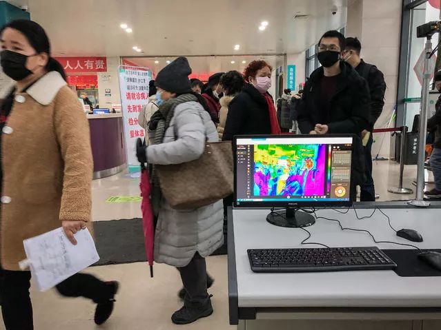 1月22日,武汉协和医院门诊大厅,红外线测温仪实时检测进入门诊大厅人流的体温。中青报·中青网记者 李峥苨/摄