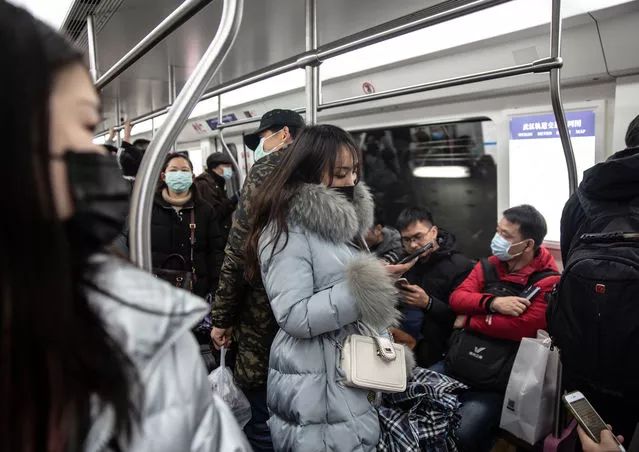 1月22日,武汉地铁2号线,开往汉口火车站和天河国际机场方向的地铁车厢内,大多数乘客戴着口罩。中青报·中青网记者 李峥苨/摄
