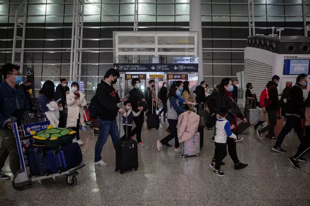 1月21日晚,武汉天河国际机场,几个出境旅行团在等待通过安检和测体温。根据机场航班信息,当天有20余个国际航班从该机场出发。中青报·中青网记者 李峥苨/摄