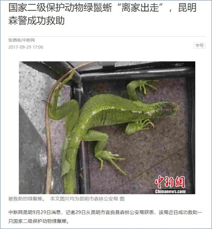 · 绿鬣蜥就是被拟制的二级保护动物。其实早已被包括原产地在内的世界各国大量繁育、出口为家庭宠物,且因繁殖快,已在全球多地造成生物入侵。但仍获得中国执法部门的积极救助,饲育者则面临牢狱之灾