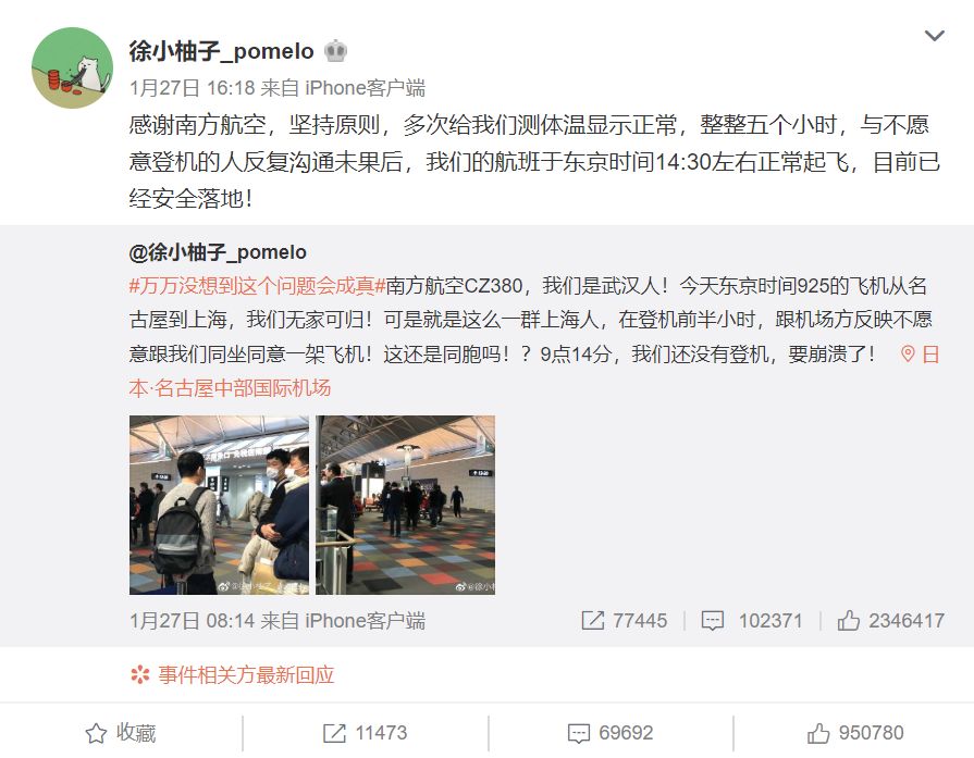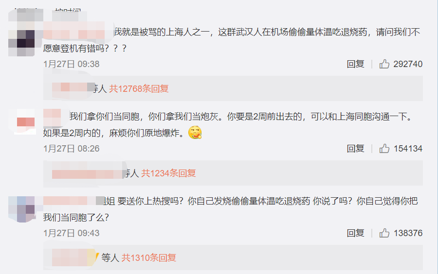 我们其实没想把事情闹大。我们在“徐小柚子”下面评论之后,有个热心网友给我发私信,说他看到了我们的事情,花钱给我买了头条,后来又被大v转了,后面我就看到我的手机一千多条提示,直接就爆掉了。有很多评论,有人比较负面,说你们上海人有什么权力叫武汉人下来,他们也是花钱上飞机的。也有人评论说,非常时刻私权要让给公权。