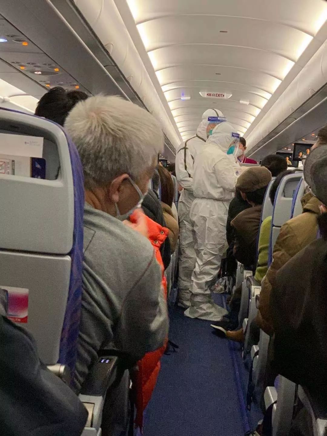 老太太发现后就给家人讲了。他们去跟南航的工作人员说,这里好像有疑似湖北那边的乘客,好像有发热现象,能不能处理一下。南航工作人员给出的说法是,让那群人坐飞机的最后两排,跟其他人隔出三排。