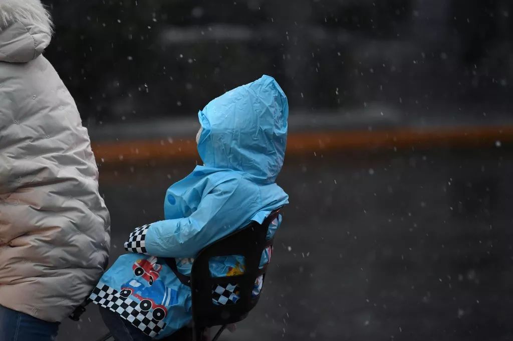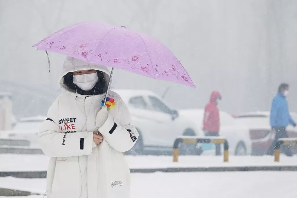 2019年12月16日,北京街头大雪纷飞,一位爸爸在雪中骑着自行车载着小朋友赶路。