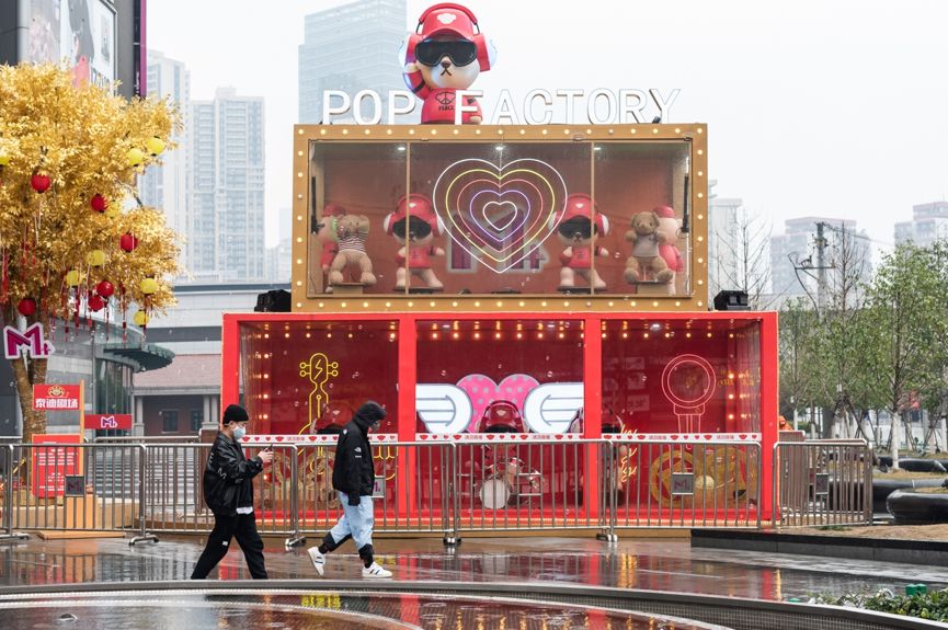 1月24日上午,除夕的武汉循礼门商圈广场上,唯有一个大型装置发出欢腾的音乐。 图丨尚飞