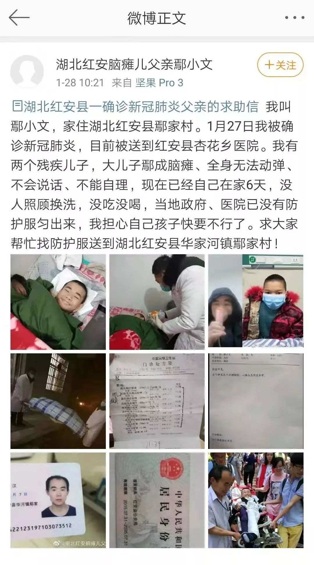 1月28日,鄢小文在志愿者协助下曾发求助微博。但据医生介绍,鄢小文至今并未被确诊感染新冠肺炎。