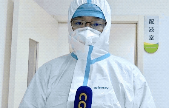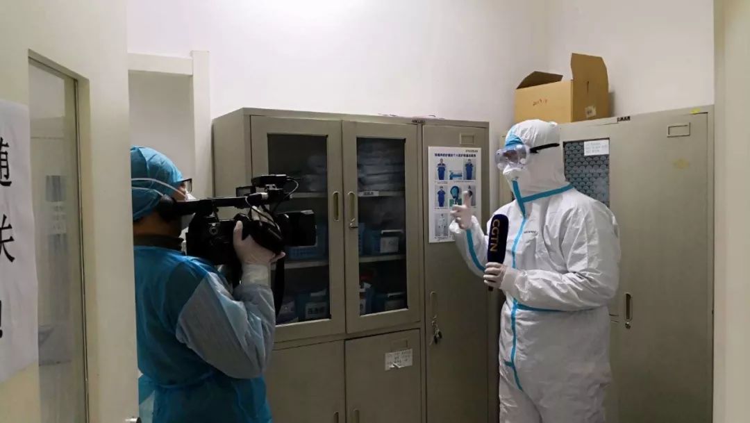 在医院进行采访(画面来源:CGTN) 到医院做采访,我们去了一个隔离病房。必须要穿防护服进去。一套大概有7件配件,它是连体的,衣服有两层,然后口罩、帽子、眼镜、手套、鞋套。穿防护服很麻烦,它必须在一个指定的小房间里面穿。防护服穿好后,鞋套穿上之前,脚不能落地,才能保证彻底的隔绝病菌,还需要有别人的帮忙,在我身后把衣服系好。折腾了20分钟,我算是穿上了。不一会儿已经觉得很闷热,密不透气。