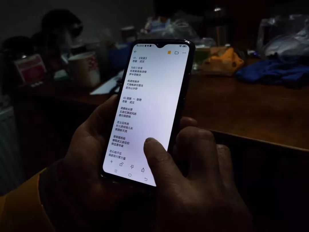 采访的新型肺炎疑似患者爱写诗,她说康复后想继续写(图片来源:界面新闻)24日大年夜这天,我们采访了一个疑似患者的家庭、一个普通家庭,也去采访了医院和在建中的火神山隔离医院。采访疑似患者家庭,他们的状态是很挣扎的,大家不知道未来的命运在哪里,像大海上随波飘荡的小船,大家不知道会遭遇什么。大年夜那天,我和同事们也没有吃年夜饭,下午吃了碗牛肉面。整个武汉也很寂静,这就是武汉大年夜晚上的状态。