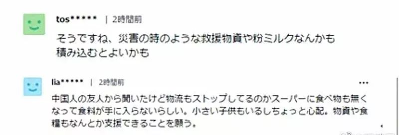 “从中国朋友那边听说物流已经停了,超市里的食物也都没有了,有点担心儿童该怎么办,希望物资和粮食也能多支援一些。”