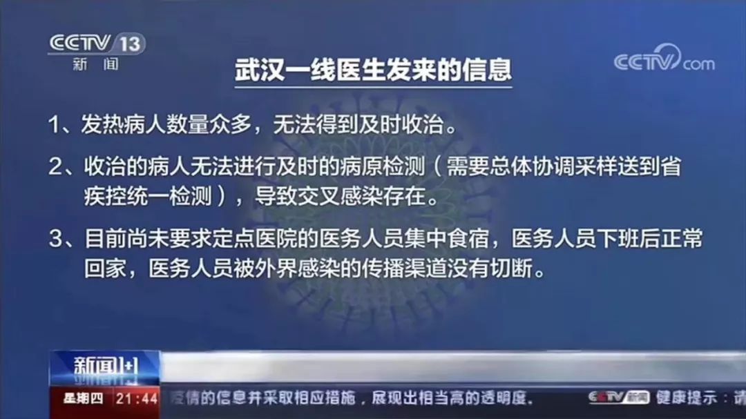 23日晚间的央视新闻,白岩松连线国家卫健委专家组成员高福,呈现了武汉一线医生发来的消息,医生们提出的问题包括:发热病人数量众多、无法得到及时收治;收治的病人无法进行及时的病原检测(需要总体协调采样送到省疾控统一检测),导致交叉感染存在;目前尚未要求定点医院的医务人员集中食宿,医务人员下班后正常回家,医务人员被外界感染的传播渠道没有切断。