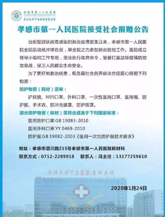 1月23日,湖北省中医院、华科大协和医院、湖北省儿童医疗中心、武汉大学中南医院、武汉市中心医院、武汉市中西医结合医院、武汉市第三医院、武汉大学人民医院等8家医院相继发出公告,向社会各界征集捐赠N95口罩、外科口罩、一次性医用口罩等防护物资。同时,武汉市周边的各县市开始在志愿组织的帮助下,自制求援的图片,向外求救。