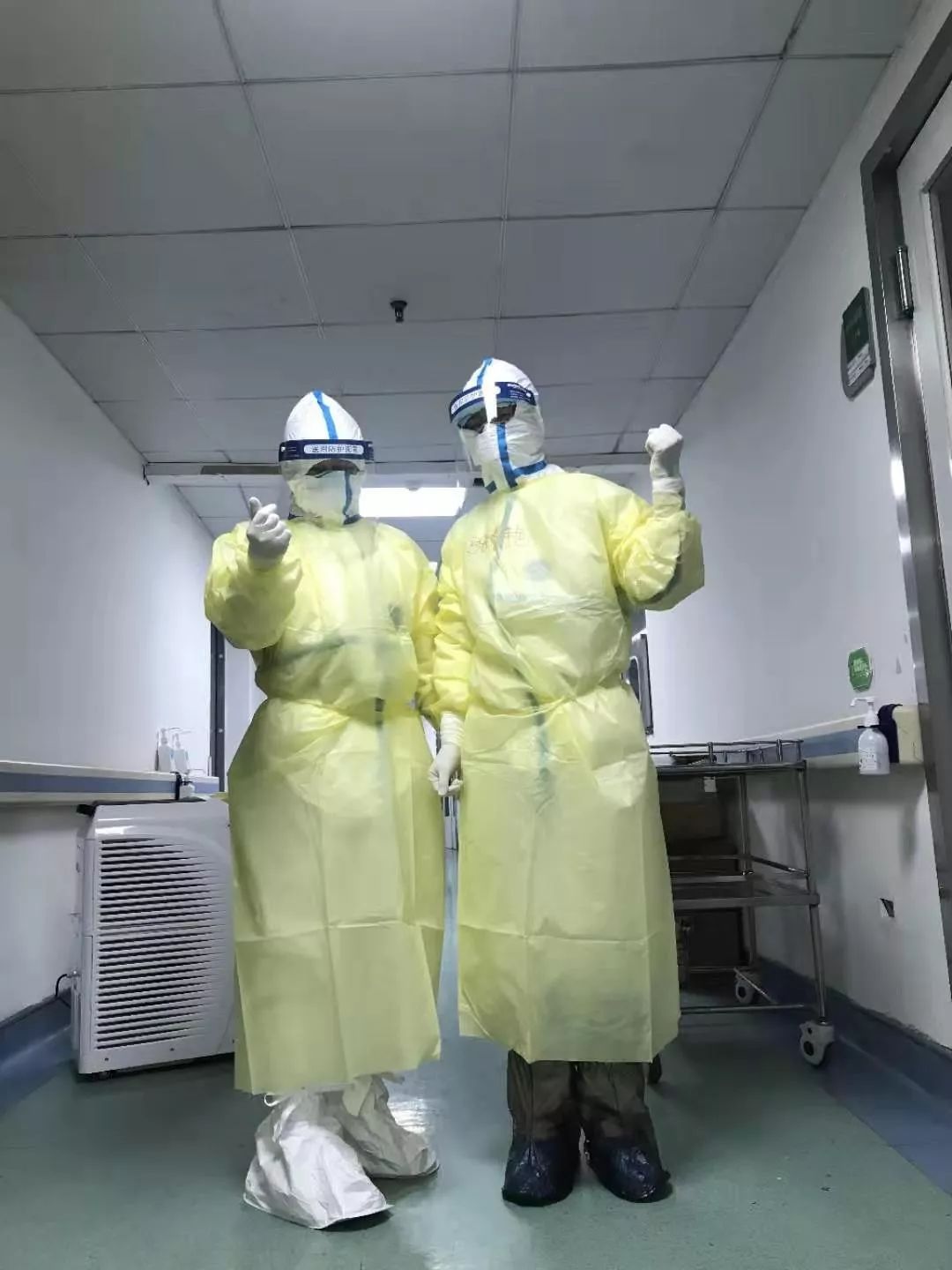 不只是这些时候,我们帮病人喂饭喂水,处理大小便、抢救,一直都是在近距离接触他们。这些病人们会经常咳嗽、打喷嚏,这是止不住的。所以如果说医生是一线,其实我们是超一线吧。我们在重症监护室里工作,手上拿着对讲机和外面对话,要什么东西,也是贴个条子在玻璃上面,他们再送进来。
