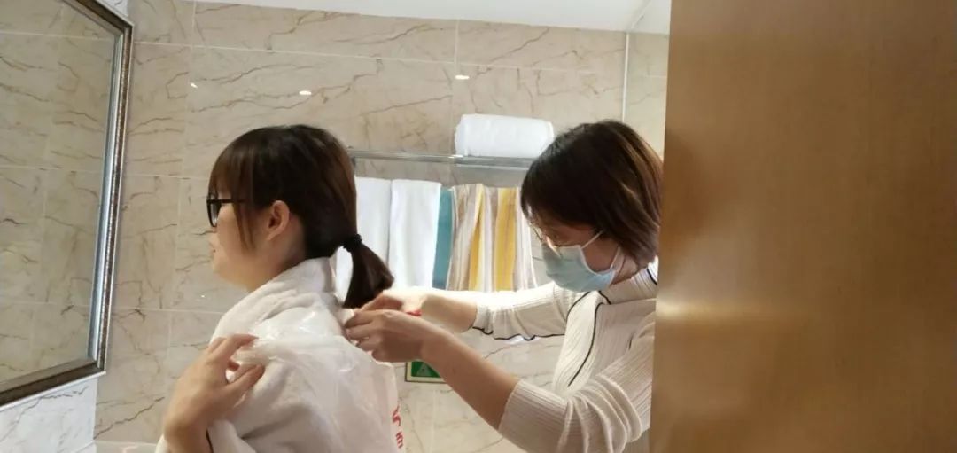 到了这边之后,我们都剪短了头发,不能去理发店,就自己在超市买了把剪刀,互相帮着剪。按规定来说,脱完防护服,我们最好是在医院里洗澡洗头,那肯定是头发短一点方便些,也容易干,所以就剪了。但也不能剪太短,要能绑起来,帽子才能遮得住。如果太短了,会从边边露出来,扎到眼睛,其实也是一个污染。