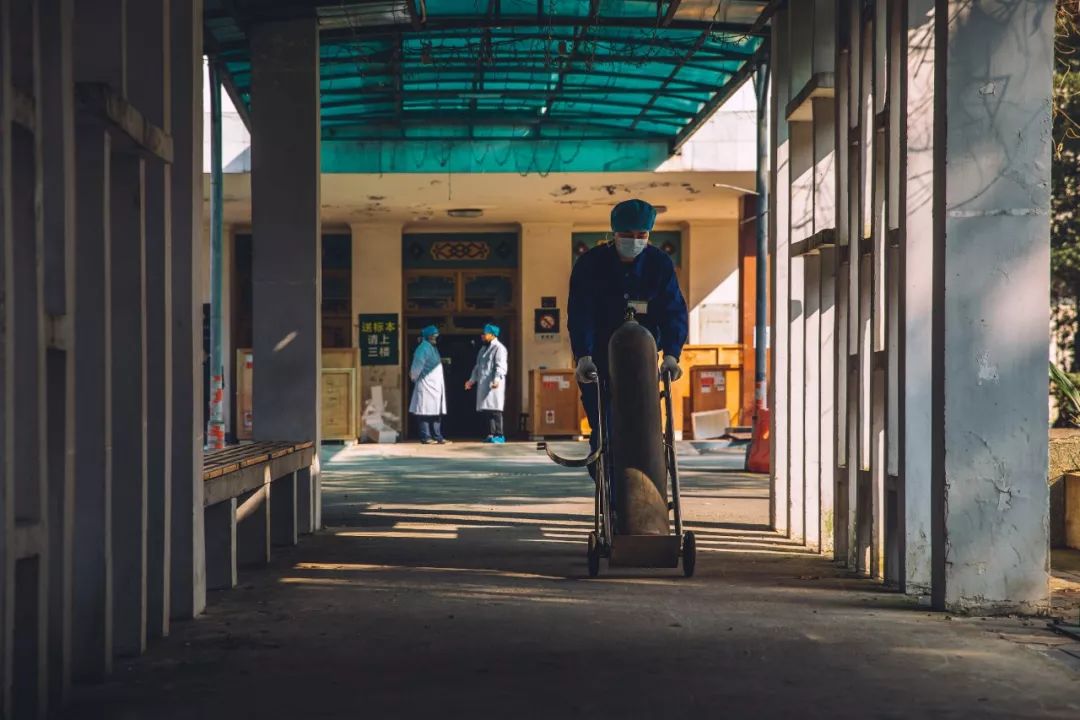 大量的氧气瓶被送进医院阴冷的武汉终于出了太阳,让医院显得没那么冰冷。
