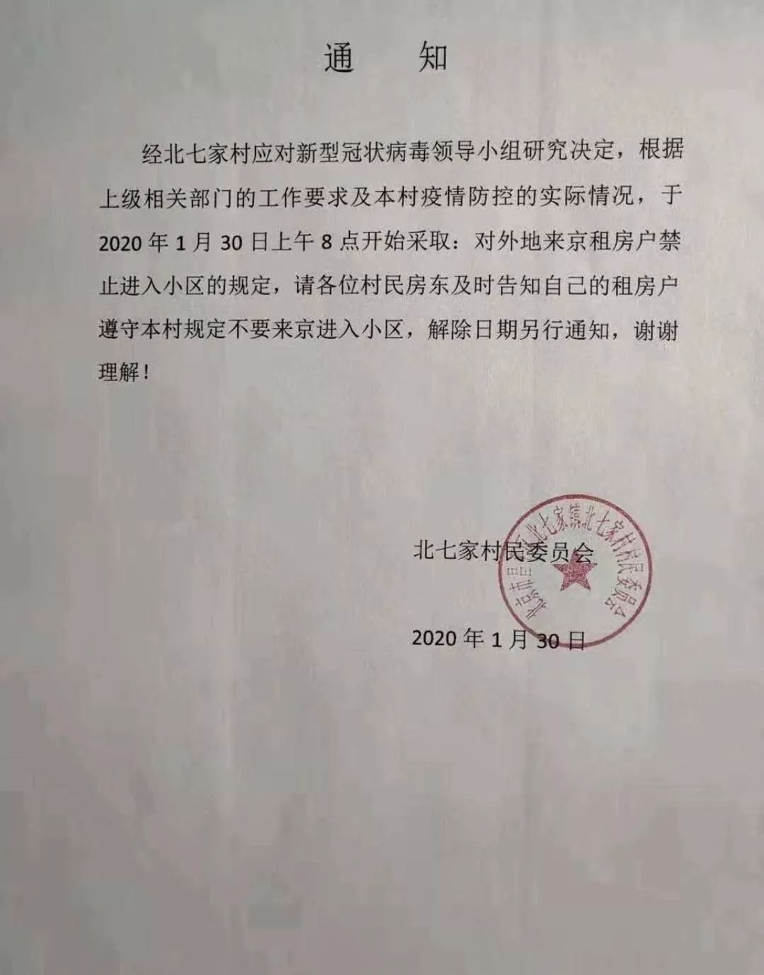 东三旗村委会门口(驳静 摄)其中一个正门口,有七八位戴着红袖章和口罩的工作人员,各有分工,岗亭里可以量体温、登记身份信息,右侧临时加设了一张条案,也用于登记。拖着拉杆箱的年轻人,是重点排查对象,除了身份证,还需出示火车票,以证明自己的出发地城市。其中到此巡逻的村委会成员告诉本刊记者,除此之外,还得打电话让房东来领人,“如果房东不愿担责任,那也不能让他们进去”。如果来者与湖北有关,“直接打120拉走去医院”,不过目前为止,尚未出现类似情况。本刊记者走到另一个大门口时,赶上值班人员的松懈时刻,测了体温后就混了进去。门内华欣超市的杨老板告诉本刊记者,他今年没回老家,守着他的超市和十几个空房间。不过房客们都回乡过年了,前几天,他挨个儿打电话给他们,转告村委的通知,“先别回北京”。东三旗这一片多有类似民房,出租给外来务工者,月租在1千左右(20平米左右厨卫兼备的独立房间)。另一位叶姓房东告诉本刊记者,他管理着上百个房间,其中七八十间的房客回乡了,应村委会要求,他也早已经将暂缓回京的通知转达了出去。杨老板告诉本刊记者,他看到的情况是,1月30日上午还是“不让进”,到了傍晚“松快了,放进来一些”,前几天,被放进社区的外来务工者数量也不多。9点半左右,本刊记者离开之前,又在回南路上看到一位拉着行李箱匆匆而行的小伙子,他说自己刚从山东回来,被挡在门外,村委告诉他“晚了5分钟”。具体“比什么标准”晚了这珍贵的5分钟,他不得而知。